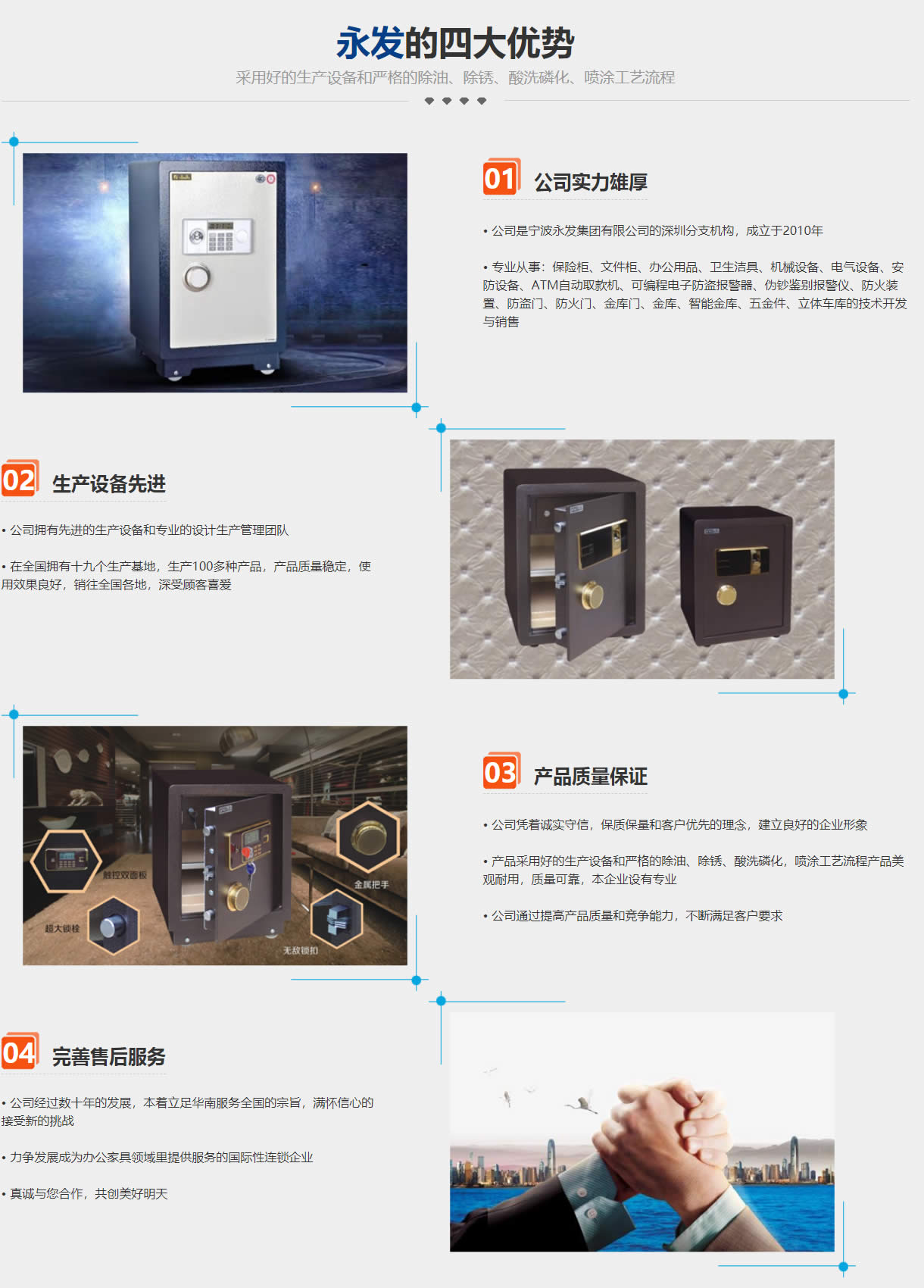 深圳永發(fā)安防產(chǎn)品有限公司 深圳永發(fā)安防產(chǎn)品有限公司,是寧波永發(fā)集團有限公司的深圳分支機構(gòu),成立于2010年,專業(yè)從事:保險柜、文件柜、辦公用品、衛(wèi)生潔具、機械設備、電氣設備、安防設備、ATM自動取款機、可編程電子防盜報警器、偽鈔鑒別報警儀、防火裝置、防盜門、防火門、金庫門、金庫、智能金庫、五金件、立體車庫的技術(shù)開發(fā)與銷售。